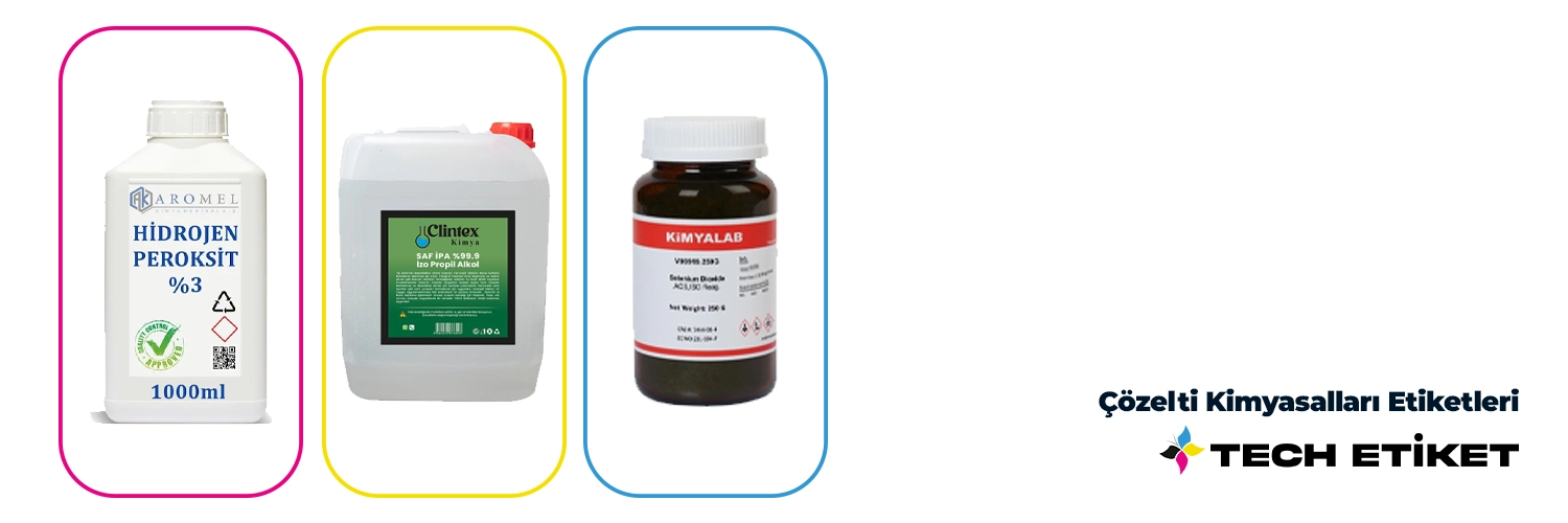 Çözelti kimyasalları genellikle laboratuvar veya endüstriyel kullanım için tasarlanmış kimyasal maddelerdir. Etiketlerde bulunan bilgiler, genellikle aşağıdakileri içerir: